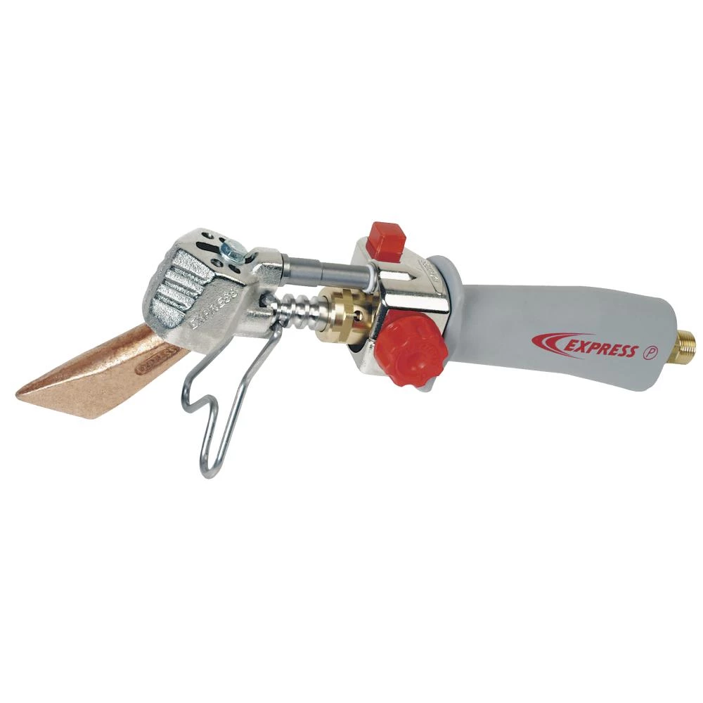 Ergonomisk gasloddekolbe med piezotænding. Monteret med standard-loddespids Express 678 (35×3,5 mm 240 g). Montage: 3/8″ venstre gevind svivel-tilslutning til slange.
