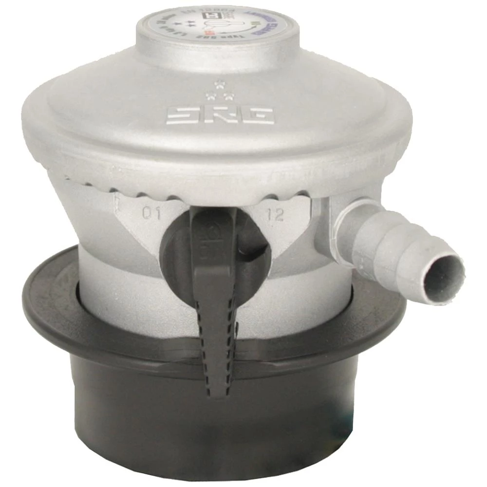 SRG lavtryksregulator med “click on” til camping, gasgrill, gasvarmeovn m.m. Kan ikke tages af og sættes på uden at være slukket.