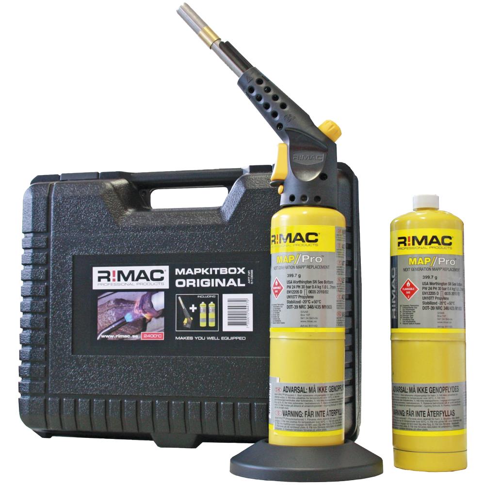 Rimac blæselampe Map Pro i kuffert med 2 Map/Pro gasdåser. Den ultimative brænder til varme- og loddeopgaver. Kan anvendes til stort set alle alm. blød- og hårdlodnings opgaver. Med Piezo-tænding, enhåndsgreb, reguleringsknap og udskiftelig cyklonbrænder. Temperatur op til 2400°C. En af de mest kraftfulde brændere på markedet. Op til 4 timers brændetid.