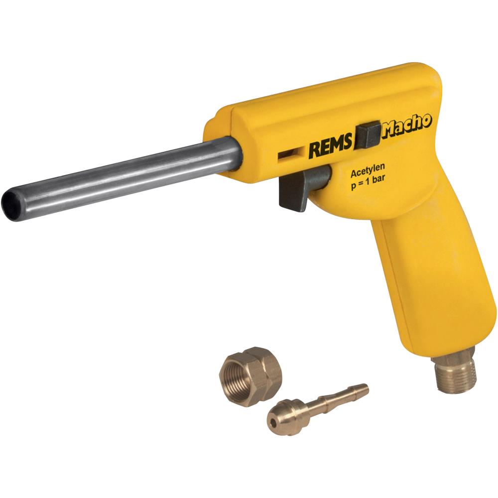 Rems Macho, lynhurtig hårdlodning. Piezo-elektrisk tænding uden tændtang. Tryk på knappen og flammen brænder. Slip og flammen slukker. Lille gasforbrug, kun 360 g/timen. Kun Acetylen. Injektionsbrænderen forbrænder luftens ilt. Derfor er kun acetylen nødvendig. Meget nem at arbejde med, ergonomisk, kan betjenes med kun én hånd. Ingen indstilling, ingen regulering. Knap, der kan låses til permanent anvendelse. Turbo-flamme. Punktflamme med turbo-spiral-forstærker. Giver høj varmeydelse og lynhurtig hårdlodning.