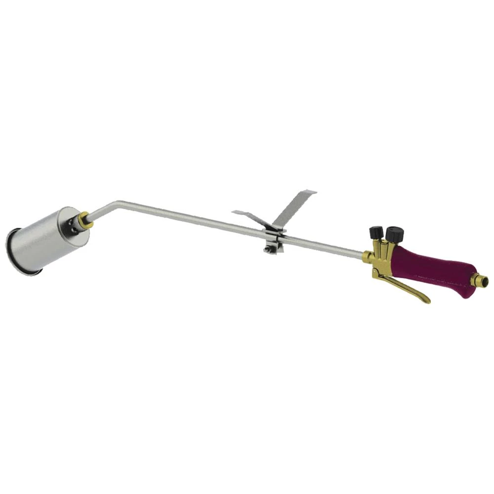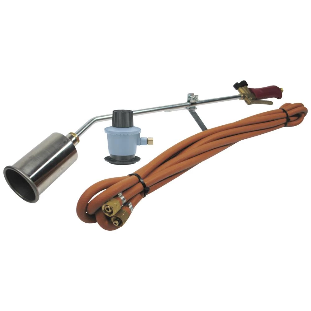 Tagbrændersæt bestående af håndtag med spareventil, 500 mm halsrør og 60 mm stormbrænder, højtryksregulator 0-2 bar, click-on, og 5 m højtryksslange med fittings. Fås som sæt eller tagbrænder alene.