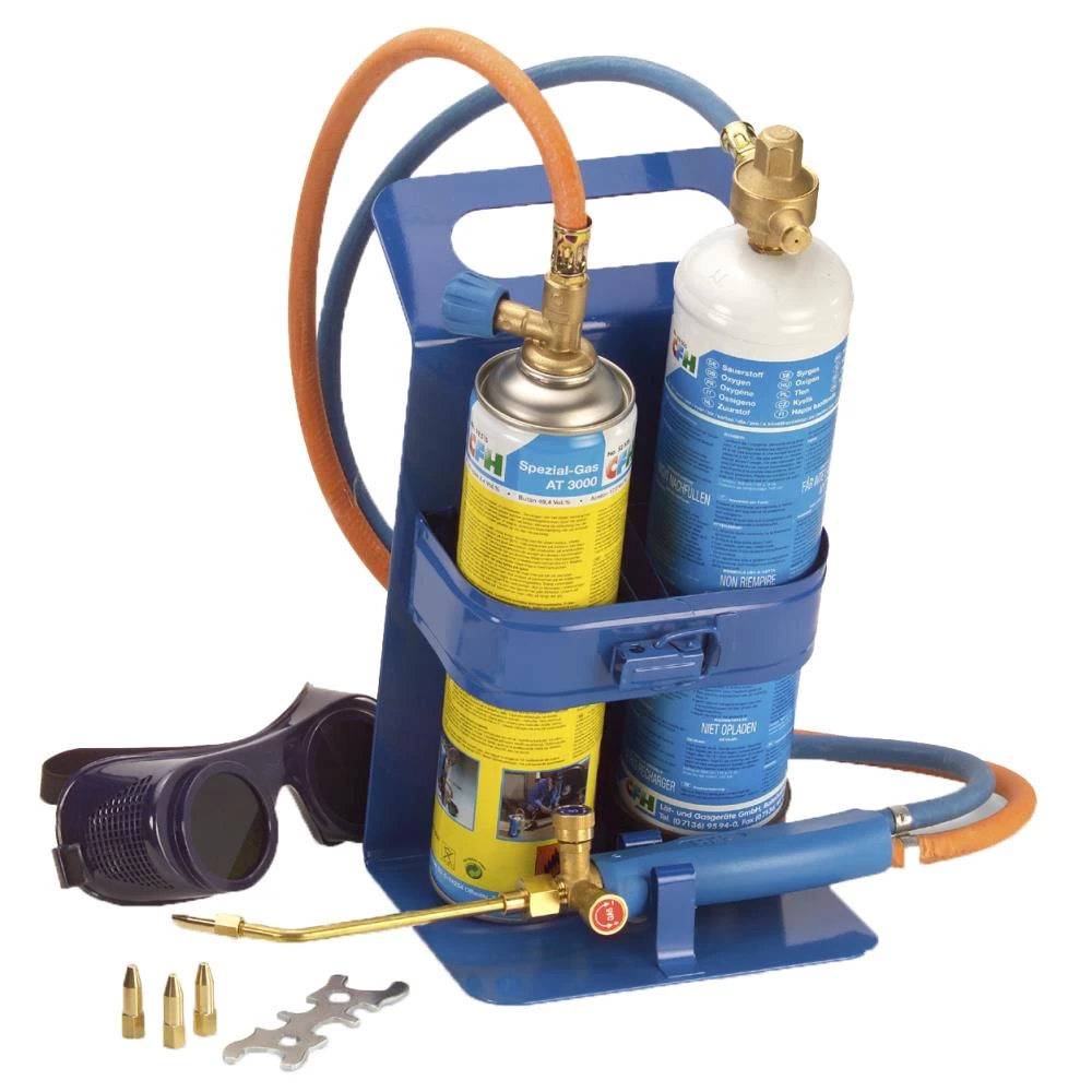 3 udskiftelige brændere, slanger, oxygen, gas, svejsebriller og metalstativ. Perfekt til vedligeholdelse og reparationsarbejde. Temperatur op til 3100°C.