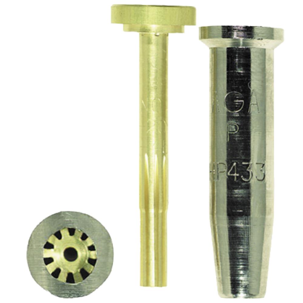 X11 HP 433 er en plantættende todelt skære dyse med slidsmundstykke til propan. Den udvendige dyse er fremstillet af kobber, og den indvendige dyse af messing. Skæreoxygenkanalen er cylindrisk og producerer en turbulensfri skæreoxygenstråle. Fås i forskellige størrelser.