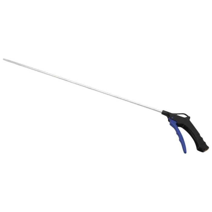 Blæsepistol med 500 mm langt messing dyse. Fremstillet i slagfast PA6 materiale. Kan modstå en belastning på op til 350 kg. Messingbøsninger, der tillader et hurtig skift af dysen eller niplen uden at beskadige pistolen.