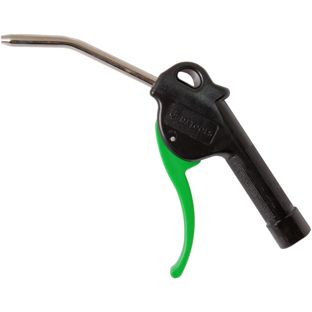 Blæsepistolen er sort. Aftrækker i DJ Tools grønne farve. “Dj Tools” er formstøbt ind i blæsepistolen. Metalbøsning i bunden af blæsepistolen. Fås med 120 mm bøjet eller 250 mm lige rør.