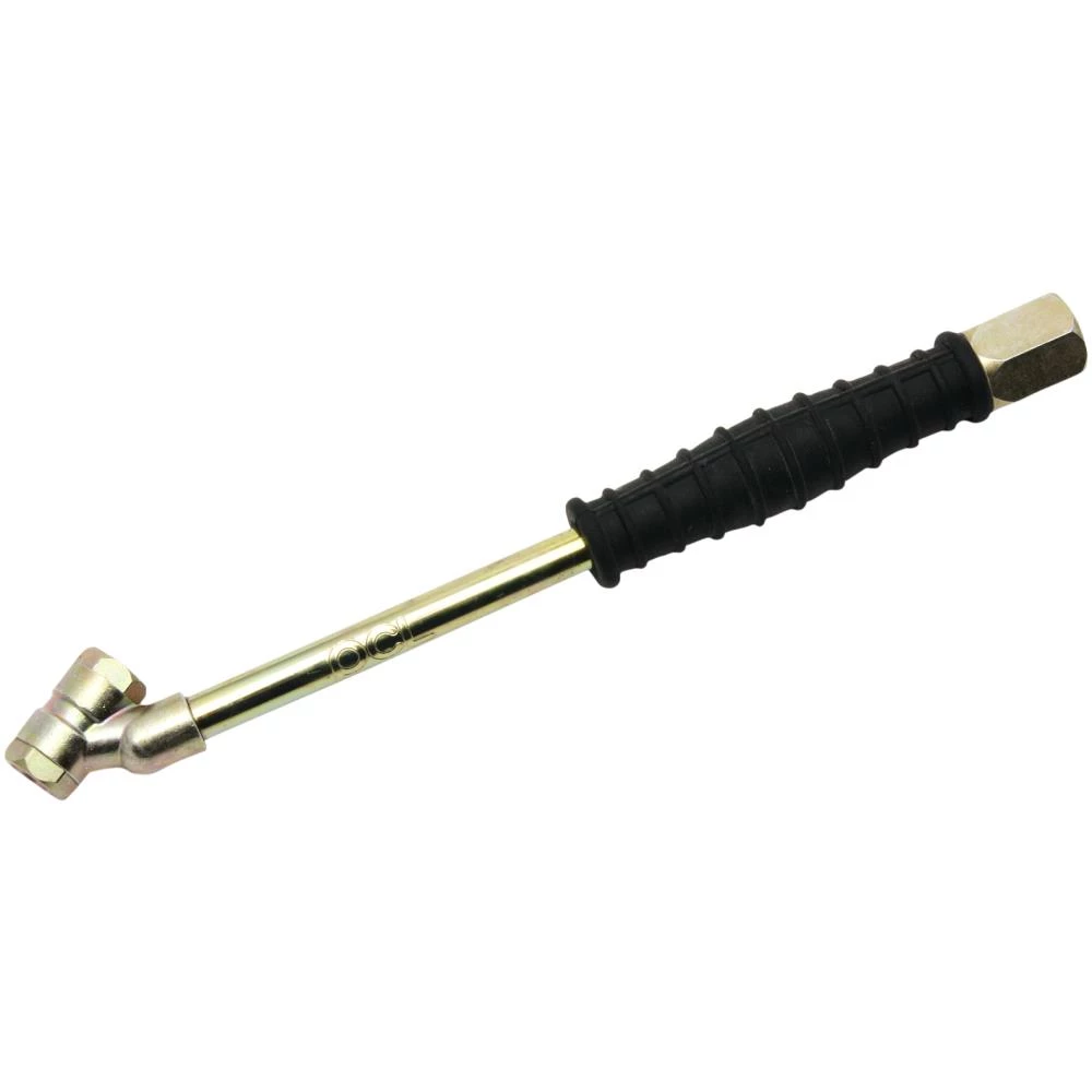 Pumpehåndtag med dobbelt pumpenippel “hold-on” – åben udgave. Bruges til bl.a. PCL dækoppumpere m.m. Pumpehåndtaget har en anordning som åbner for dækkets ventil når den er i brug. Sort håndtag indikerer “åben” type.