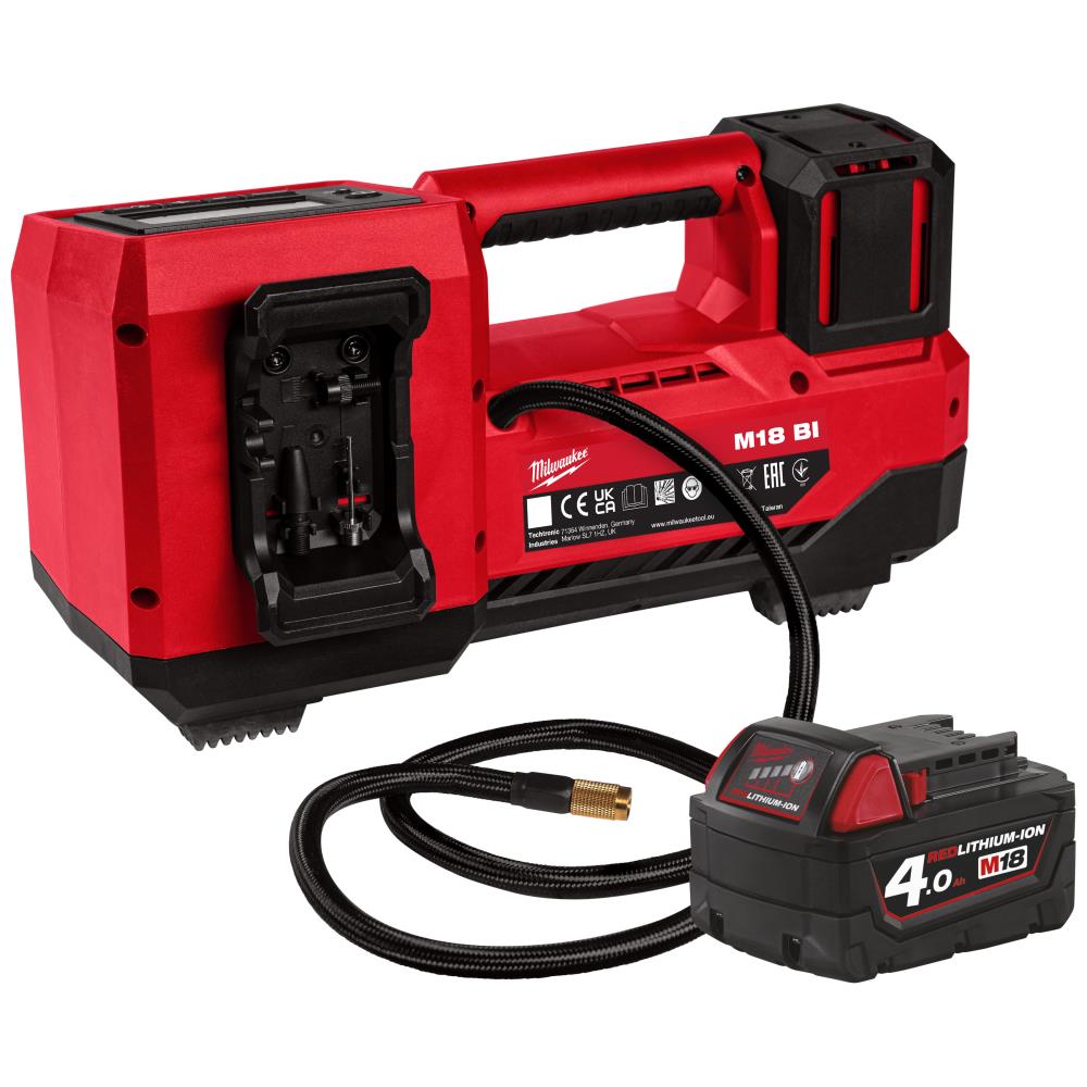 Sampak med M18 luftpumpe BI og Redlithium batteri B4 (18 V /4,0 Ah). Letvægt luftpumpe til hurtig pumpning af bil- og lette lastbildæk. Automatisk sluk-funktion pumper dækket op til det forud valgte tryk for nøjagtig oppumpning. Pumper op til 30 dæk på et fuldt opladt M18 5,0 batteri. Maks. kapacitet på 10,3 bar. 4 trykindstillinger og 3 måleenheder. Oplyst LCD-display med digital trykmåler. Leveres med pumpenål til bolde, presta fatning, pumpemundstykke og schrader fatning. Redlithium batteri med Redlink elektronisk overbelastningsbeskyttelse. Individuel celleovervågning. Holdbar batterikonstruktion. Tåler varme- og kuldeudsving. Fungerer ved driftstemperaturer ned til ÷20°C. Afladningsbeskyttelse forhindrer skader på battericellerne fra overafladning. Integreret strømindikator.