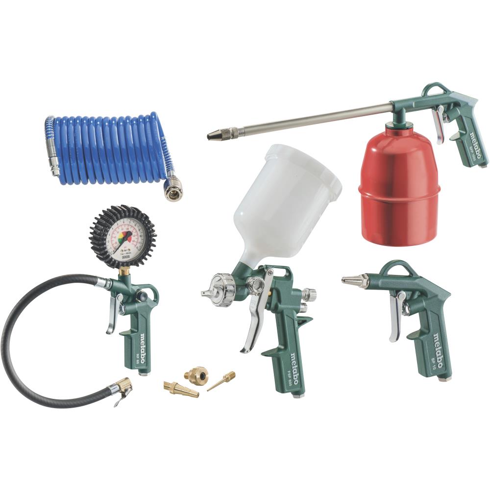Blæsepistol, dæktryksmåler inkl. adapter med nålenippel, malerpistol med beholder, sprøjtepistol, PA-spiralslange og EURO-stiknippel ¼”.