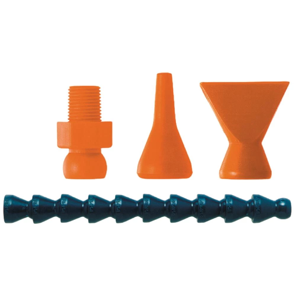 Cool line modulsystem til lavtryksanvendelser. Kapacitet afhængig af viskositet, mundstykke og længde på slangen. Cool line omfatter en bred vifte af tilbehør og dele såsom runde dyser, flade dyser med gevind skrueforbindelser, Y distributører, afspærringsventiler, faste linjer, metal distributionssystemer osv. Sæt med: 20 stk. slangeled, 3 stk. rundt-mundstykker ø1,6 mm – 3,2 mm – 6,4 mm, 1 stk. fiskehaledyse, samt 2 stk. tilslutninger hhv. 1/4″ og 1/8″ NPT.
