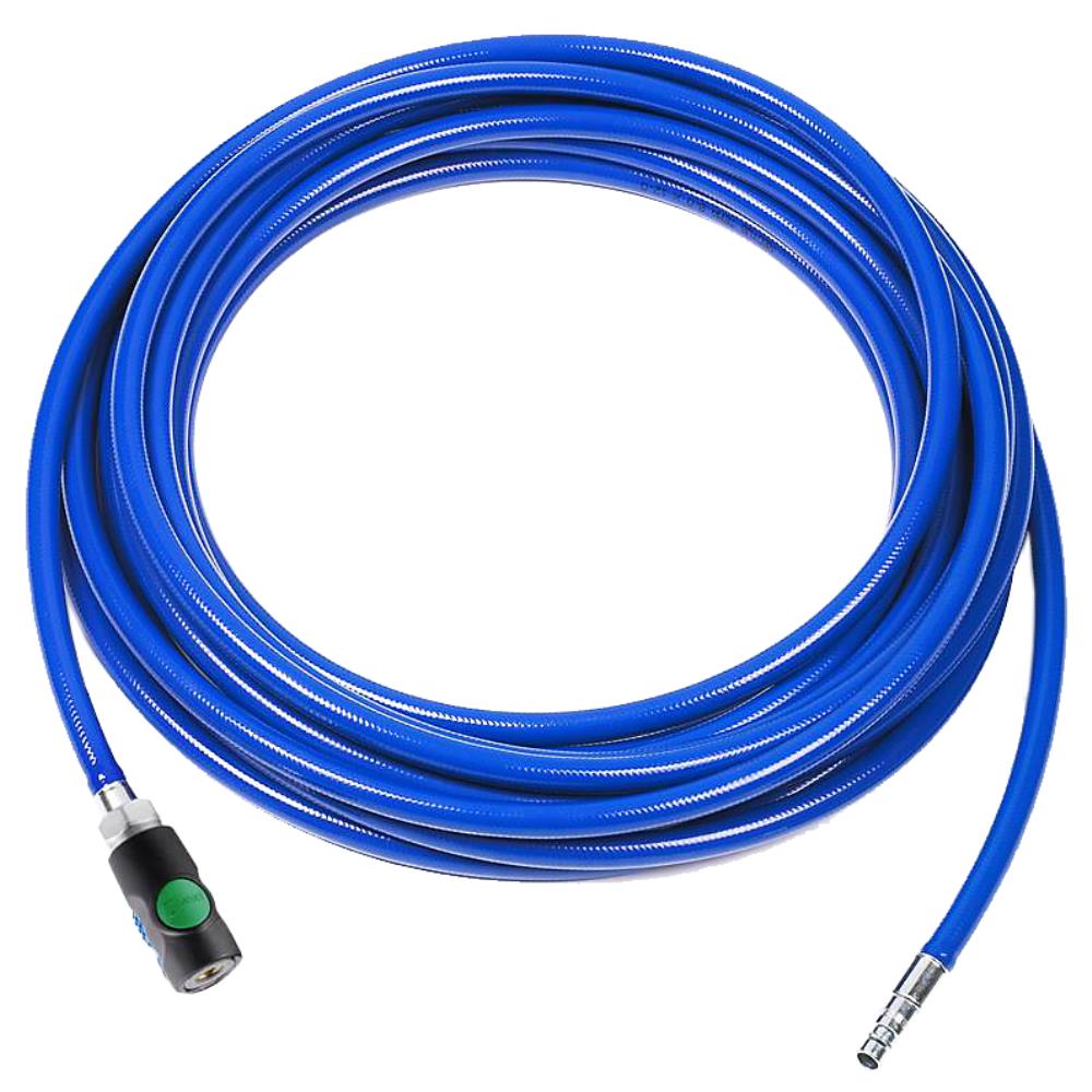 Professionel trykluftslange i blå armeret polyesterbaseret polyurethan (PUR). Fleksibel, ekstrem let og absolut olie- og UV-resistent. Maks. arbejdstryk 16 bar, temperatur -20°C til +80°C. Monteret med sikkerhedskobling, som forhindrer utilsigtet frakobling ved fx tab på gulv, og eliminerer rekyl ved frakobling.