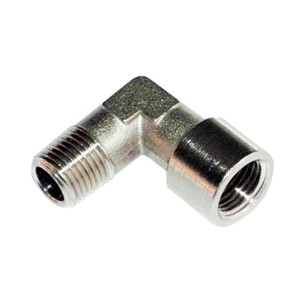 Vinkel med samme størrelse udvendig gevind i begge “ender”. Forniklet messing. Fås i flere dimensioner.