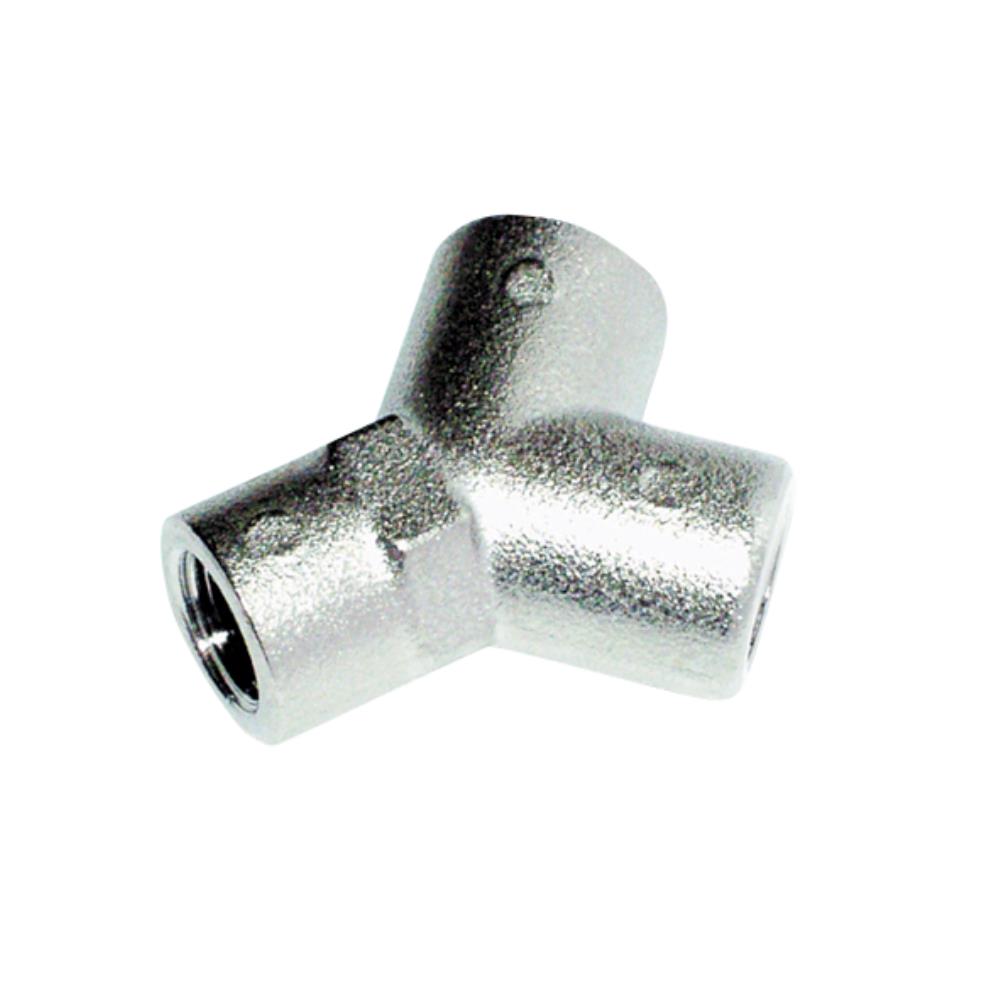 Y-stykke med samme størrelse gevind i begge “ender”. Forniklet messing. Fås i flere dimensioner.