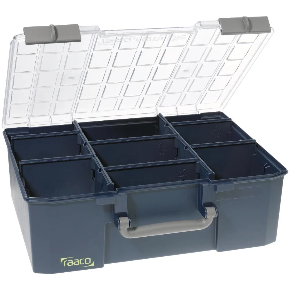 Dyb sortimentsæske med 8 flytbare skillevægge til ruminddeling. Forsynet med 2 skydelåse og håndtag. Fremstillet af polypropylen (PP) samt stærkt låg af polykarbonat (PC).