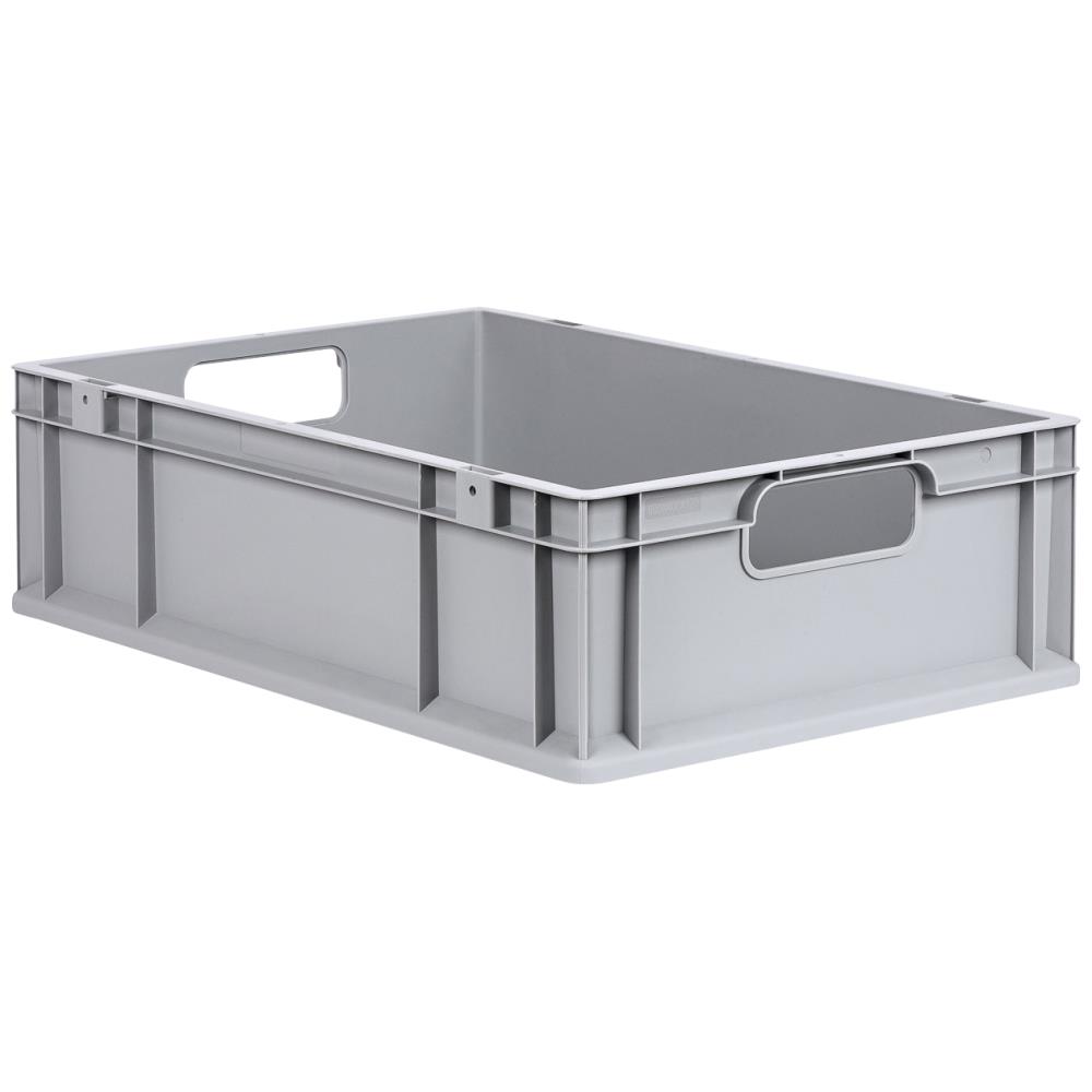 Lagerkasse grå plast 600×400×170 mm åbne greb. Eurobox NextGen Economy er en robust, brudsikker og fleksibel lageropbevaringskasse med åbne greb. Kassen er fremstillet af 100 % genanvendeligt polypropylen i industriel-kvalitet, der sikrer høj bære- og belastningsevne. Eurobox NextGen er ideel til lagring, opbevaring og transport takket være en selvcentrerende stablingskant og forstærkede vægge. Temperaturbestandig fra ÷20°C til +75°C og desuden syrefast og olieresistent. Kassen kan udstyres med fx låg, hængsellåg, kliklåse og hængselsbeslag – medfølger ikke men kan tilkøbes. Fås i flere størrelser.