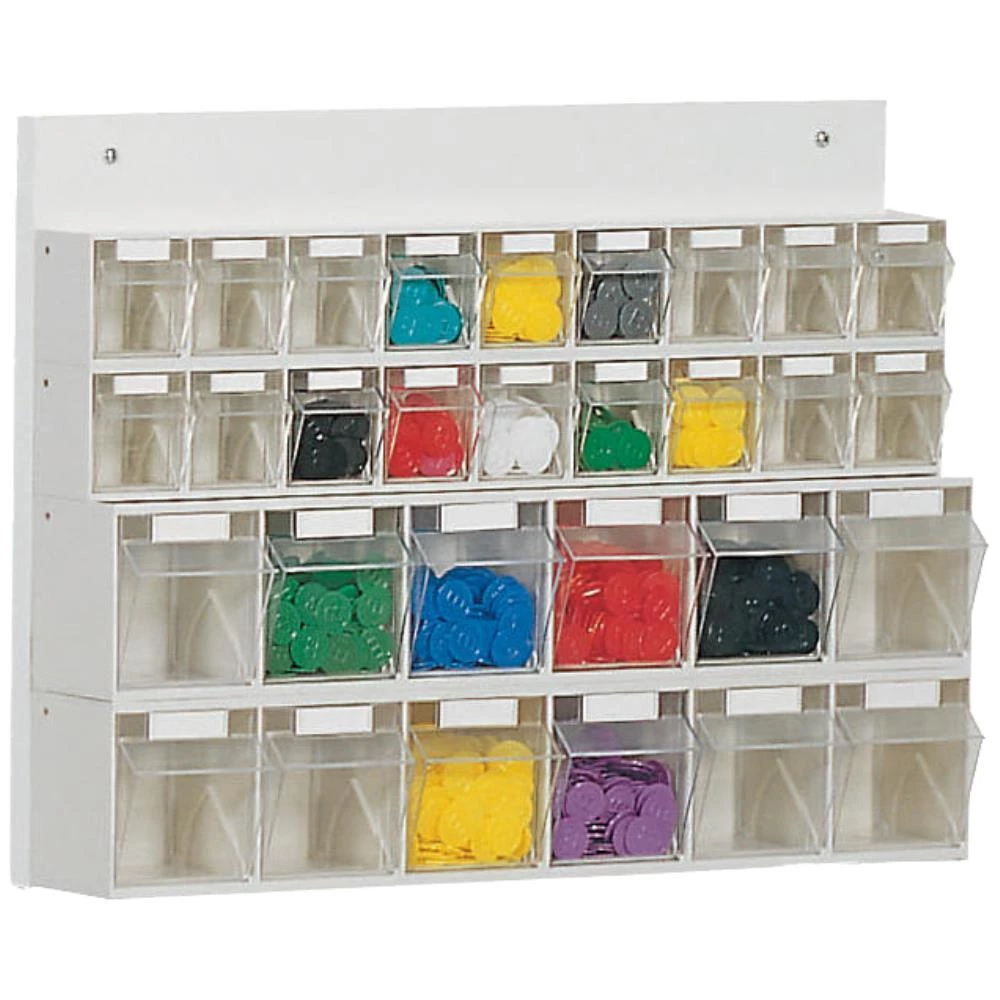 Vægmonteret kabinet med tiltboxe til opbevaring og organisering af lettere smådele fx. skruer, søm og bolte. Bagplade i hvid melamin. Tiltboxen virker således, at man trækker i håndtaget på boxen og den øverste halvdel af boxen vipper ud og man kan fylde i og/eller tage ud. Inkl. etiketter som gør det nemt at danne et overblik. Fås i mange varianter og kan bygges sammen i større systemer.