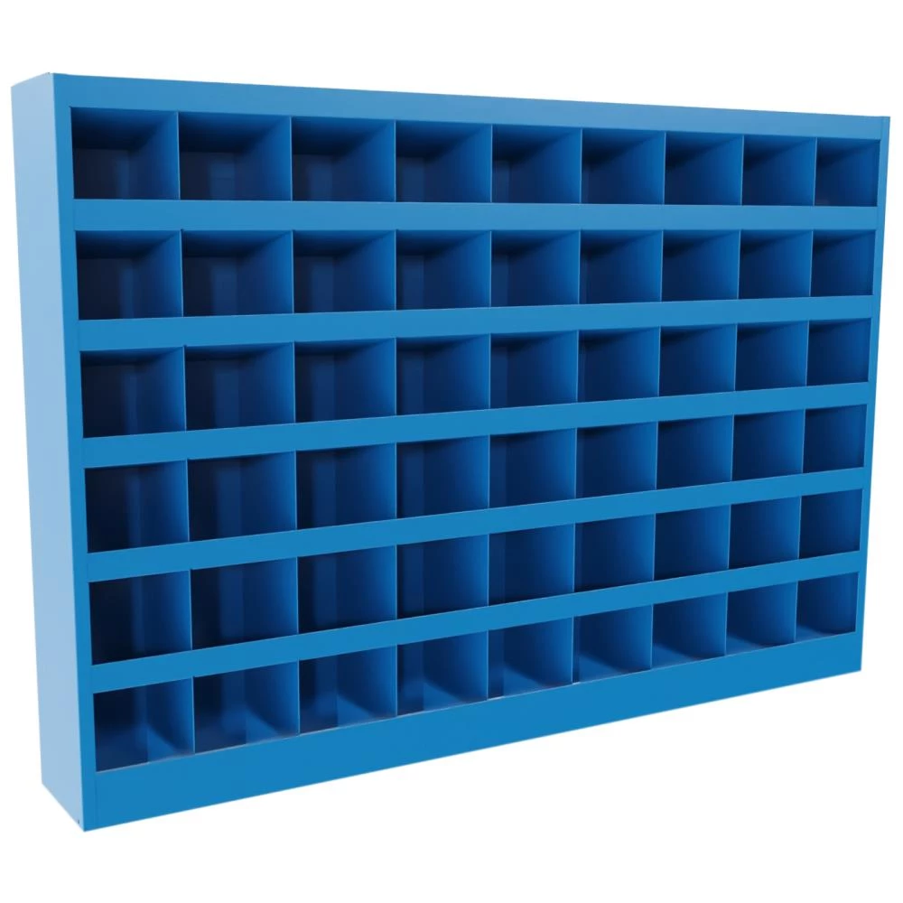 Boltreol med skillevægge. Svejst kabinet, som er forberedt til vægophæng. Fås i flere varianter med enten lukket eller åben top, sidstnævnte giver mulighed for pladsbesparende udnyttelse af reolens top og er desuden konstrueret med fleksibel rumstørrelse.