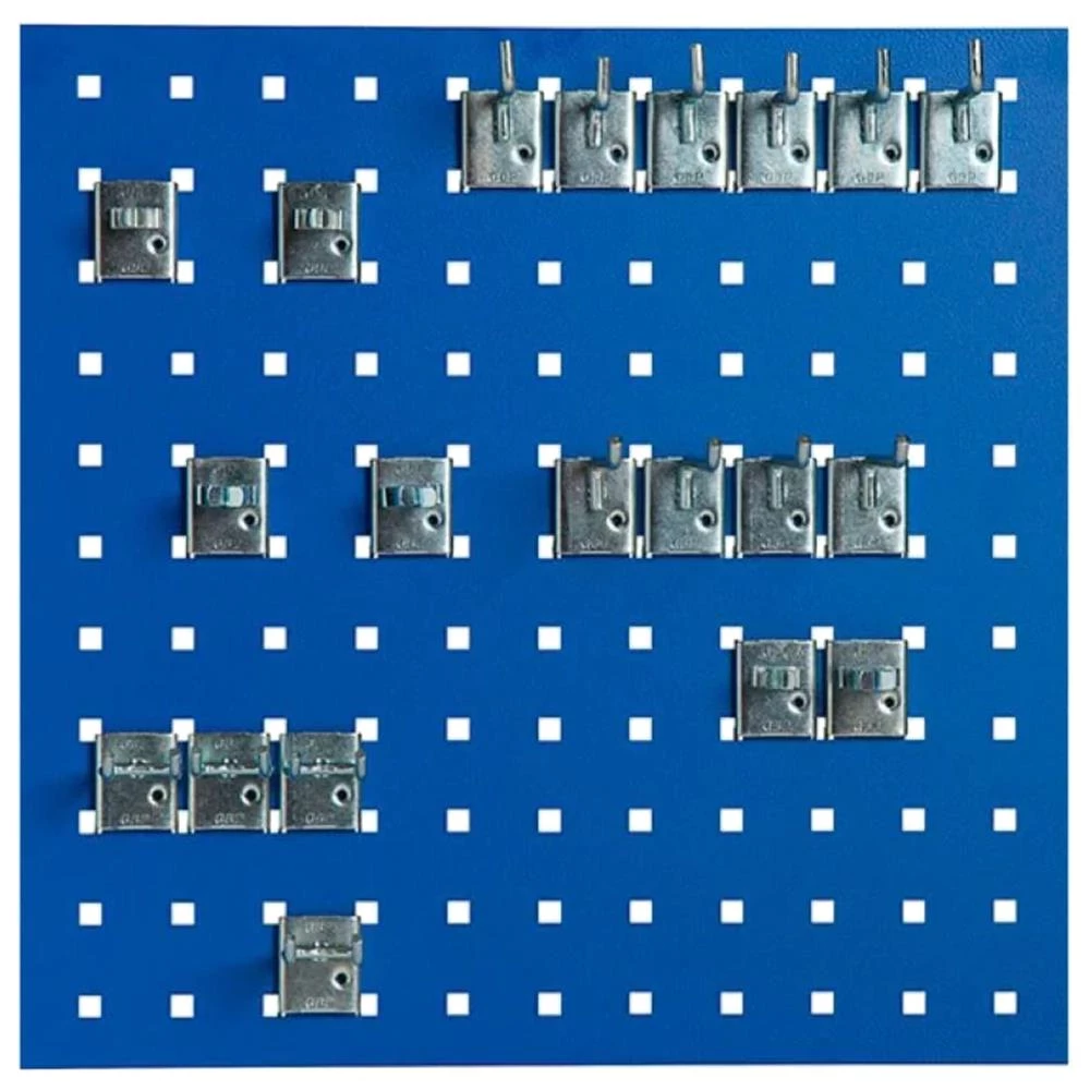 Krogsortiment: 4 stk. enkeltkrog ø6 mm (210016), 6 stk. enkelt vinkelkrog ø6 mm (210029), 3 stk. fjederklemme ø12 mm (210046), 3 stk. fjederklemme Ø18 mm (210047) og 4 stk. dobbeltkrog ø5 mm (210022). Til montering på værktøjstavle/-panel med 38 mm hulafstand.