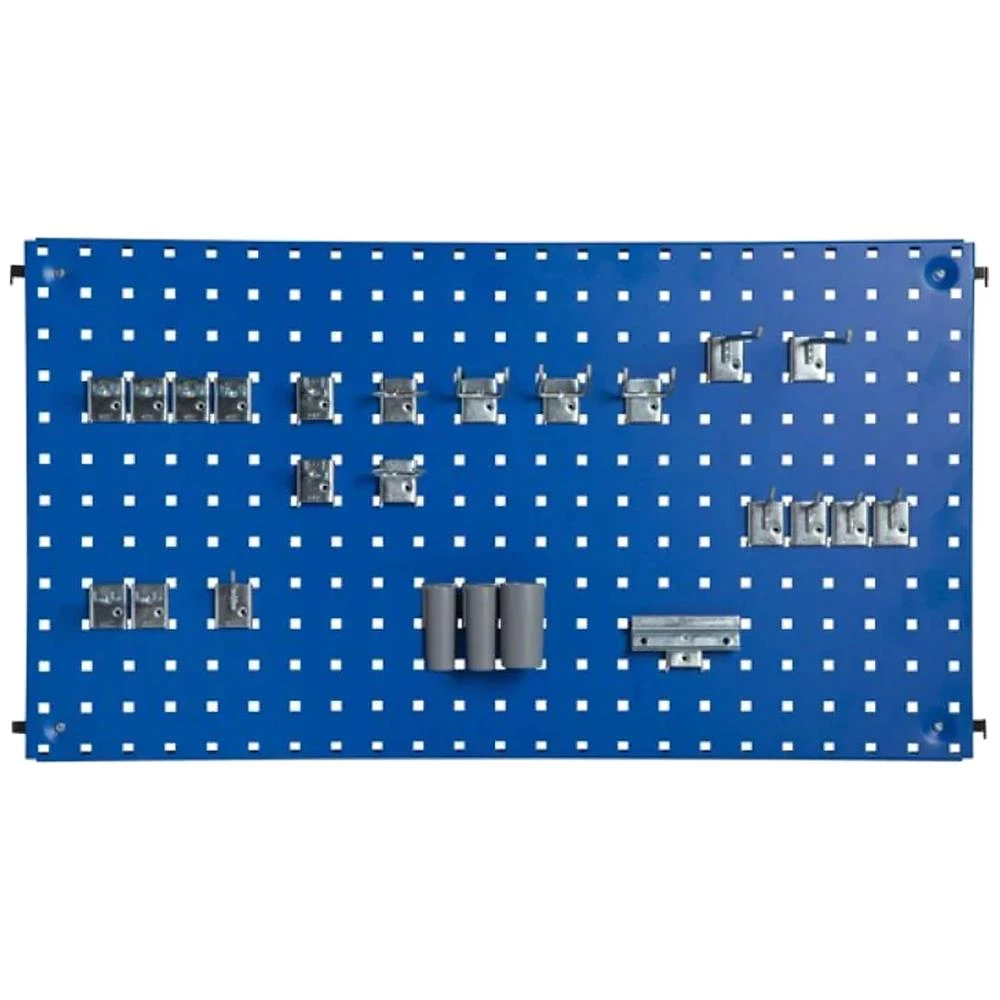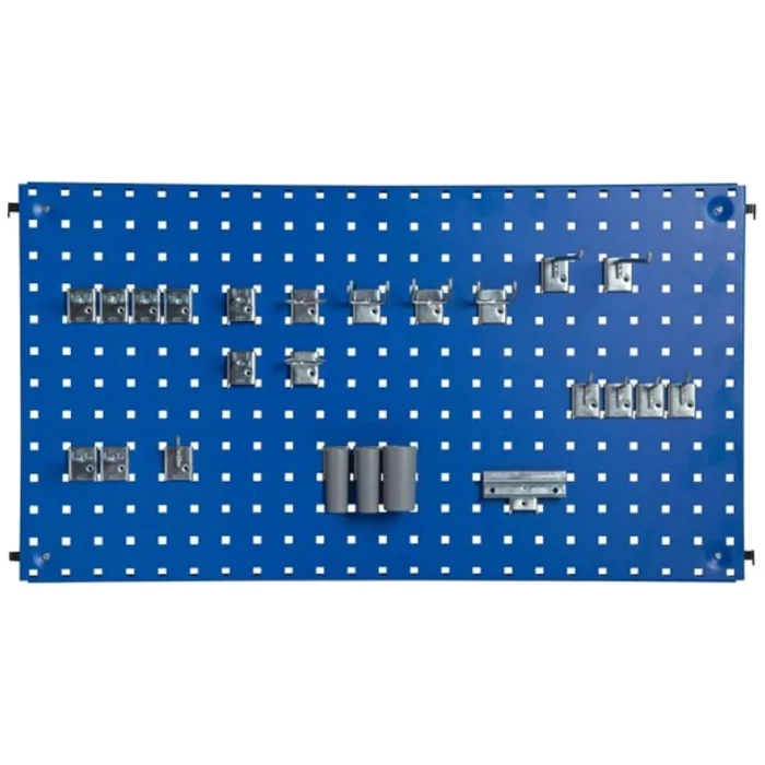 Krogsortiment: 5 stk. enkeltkrog ø5 mm, 2 stk. enkeltkrog ø6 mm, 6 stk. dobbeltkrog ø5 mm, 2 stk. dobbeltkrog ø5 mm, 2 stk. tangkrog ø5 mm, 3 stk. dobbelt vinkelkrog, plastboxholder, 2 stk. rørholder ø13 mm, rørholder ø24 mm og rørholder ø34-38 mm. Til montering på værktøjstavle/-panel med 38 mm hulafstand.