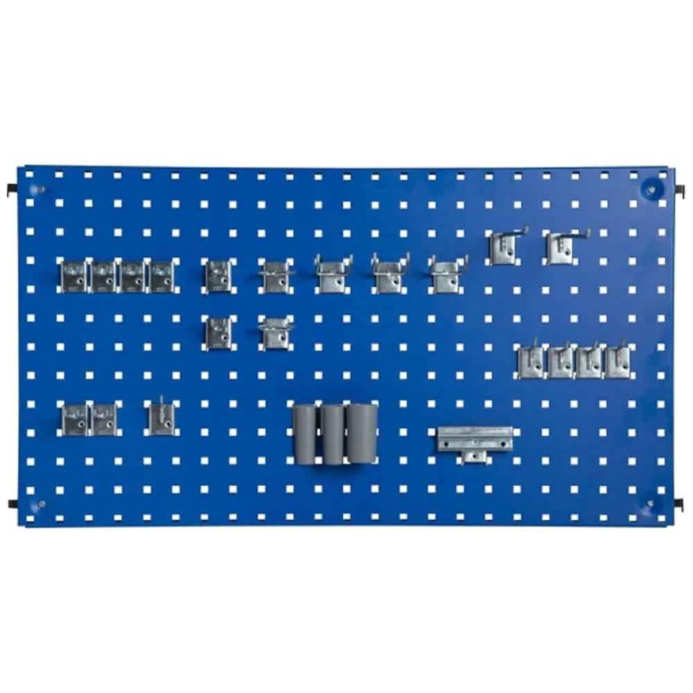 Krogsortiment: 5 stk. enkeltkrog ø5 mm, 2 stk. enkeltkrog ø6 mm, 6 stk. dobbeltkrog ø5 mm, 2 stk. dobbeltkrog ø5 mm, 2 stk. tangkrog ø5 mm, 3 stk. dobbelt vinkelkrog, plastboxholder, 2 stk. rørholder ø13 mm, rørholder ø24 mm og rørholder ø34-38 mm. Til montering på værktøjstavle/-panel med 38 mm hulafstand.