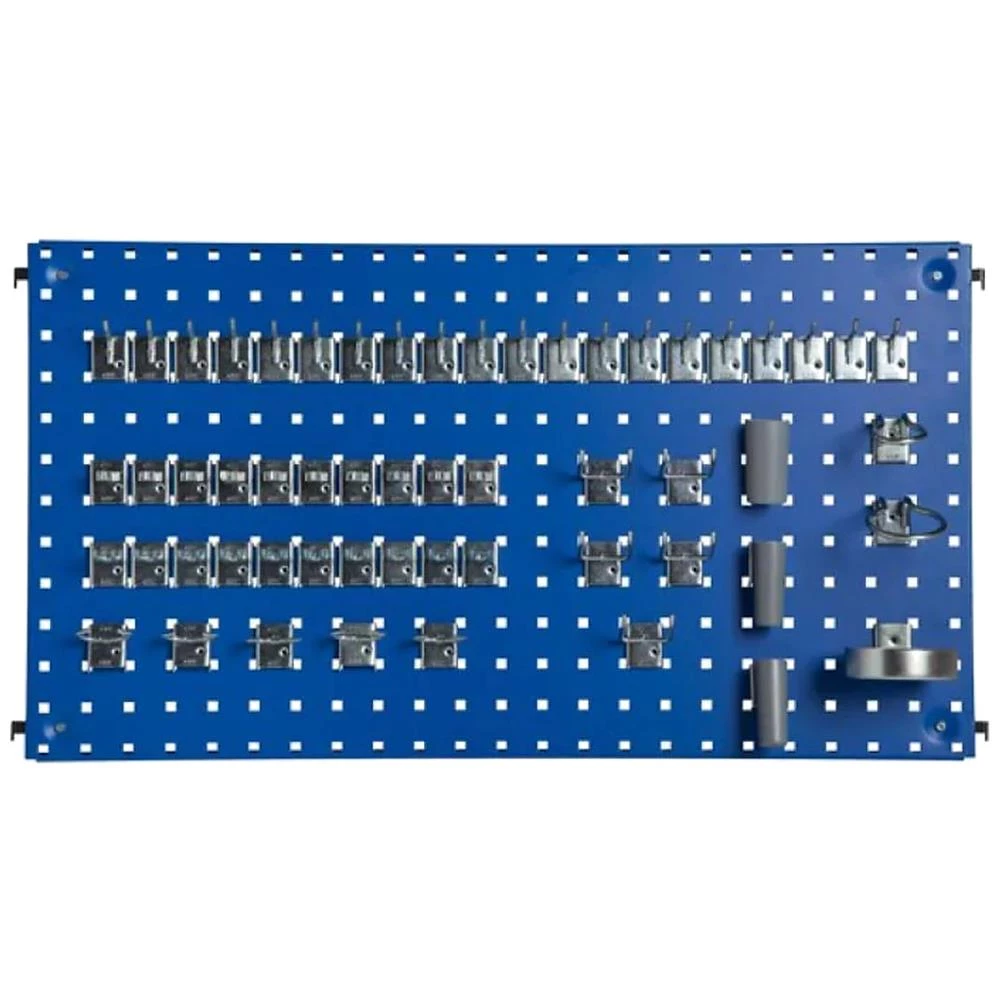 Krogsortiment: 20 stk. enkeltkrog ø5 mm, 10 stk. dobbeltkrog ø5 mm, 5 stk. tangkrog ø5 mm, ringkrog ø40 mm, ringkrog ø50 mm, 10 stk. fjederklemme ø12 mm, 5 stk. dobbelt vinkelkrog, 3 stk. rørholder ø24 mm, oliekandeholder ø104 mm og holder inkl. kasse. Til montering på værktøjstavle/-panel med 38 mm hulafstand.
