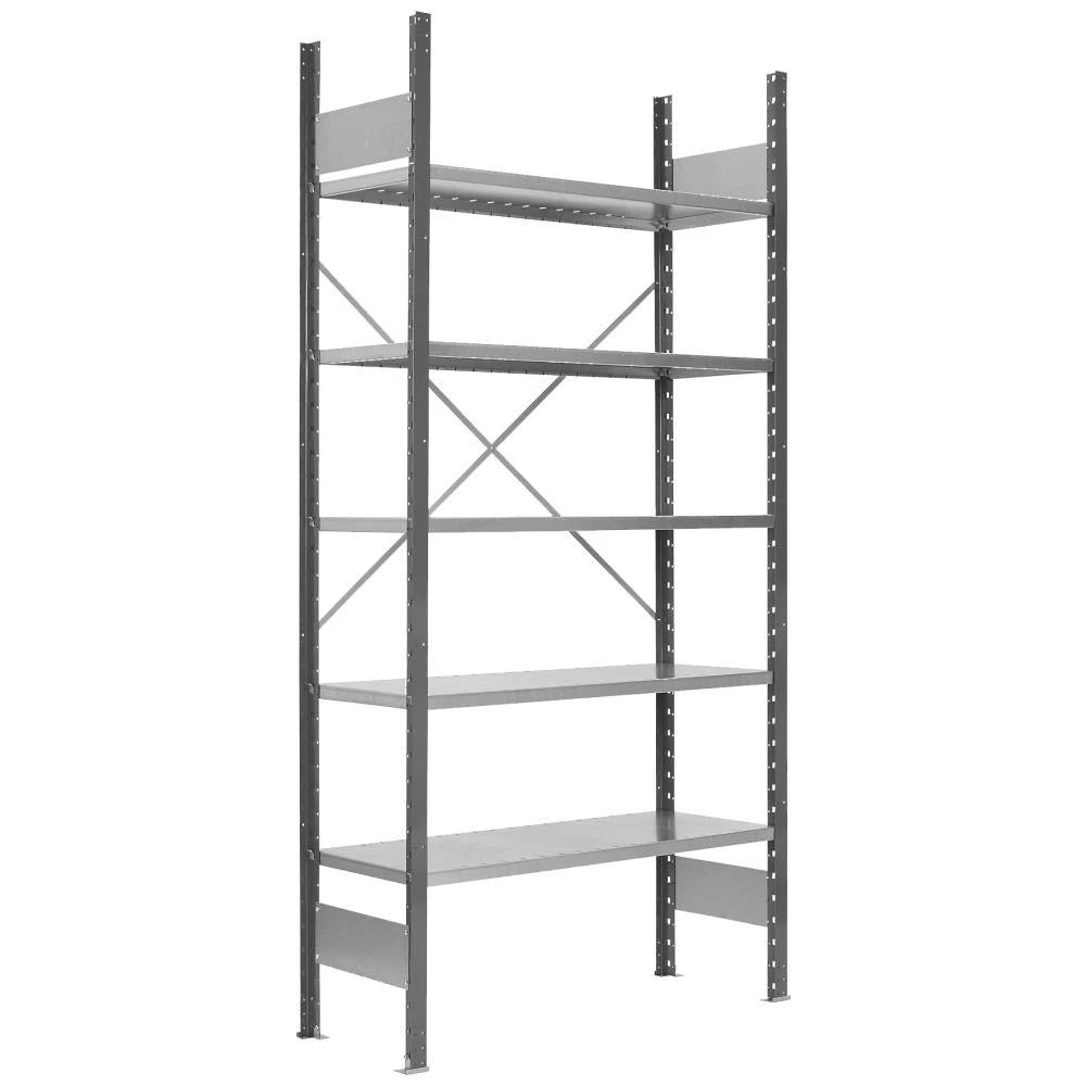 Stållagerreol med åben gavl. Startsektion leveret komplet med 4 stolper med fod, 4 tværplader, 1 rygkryds og 5 galvaniserede hylder med hyldekroge. Følgesektion leveret komplet med 2 stolper med fod, 2 tværplader, 2 rygkryds og 5 galvaniserede hylder med hyldekroge. Reolen er enkel at montere. Leveres i to højder hhv. 2.100 og 2.500 mm samt fire forskellige dybder 300, 400, 500 eller 600 mm. Kapacitet: 135 kg pr. hylde, jævnt fordelt. Opfylder normen SS2241. Et reolsystem der kan opbygges efter egne ønsker og med stort tilbehørsprogram.