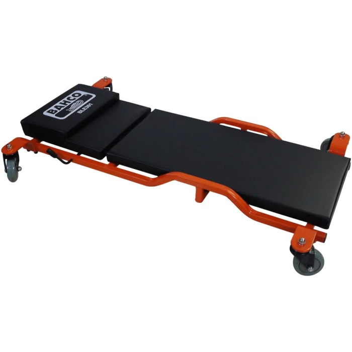 Liggebræt. Højde kun 120 mm. Kapacitet 135 kg. Polstret pude med god komfort i modstandsdygtigt materiale. Forsynet med stålramme. Hoveddelen kan indstilles i 3 forskellige positioner. Ophængskrog på bagsiden for nem opbevaring. 4 drejelige (360°) PVC hjul Ø75 mm i diameter og 25 mm i bredden.