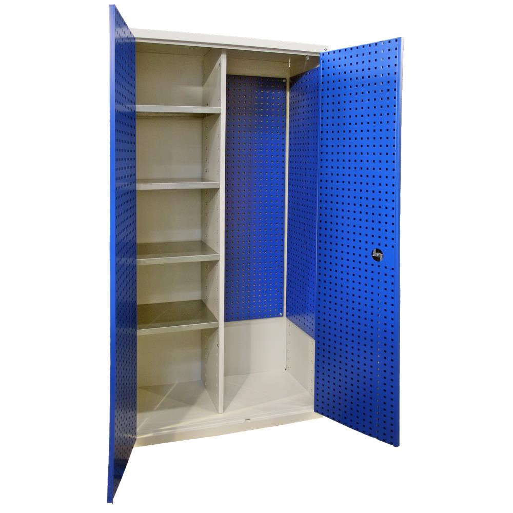 Meget solidt materialeskab med masser af fleksibel opbevaringsplads. Individuel indretning med mulighed for værktøjstavler, hylder og/eller bøjlestang. Dækker behovet for opbevaring af værktøj, maskiner, arbejdstøj osv. Låger med udvendige hængsler åbner 180°. Fremstillet af fuldsvejst stålplade. Udvendige mål (H×B×D): 2.000×1.000×500 (445) mm. Fås i flere varianter.