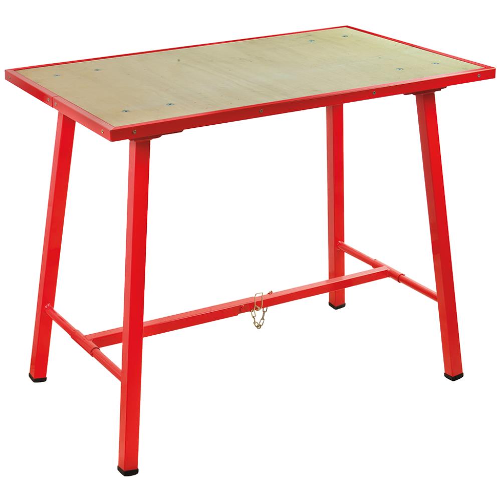 Mondelin arbejdsbord med foldbare ben. Robust design og solide materialer. 25 mm bordplade af PEFC-certificeret træ og bordben i 35×35 mm stålrør sikrer en stærk og stabil konstruktion. Skridsikre gummifødder giver et fast underlag og boltede bordben øger sikkerheden. Med en maksimal belastning på 150 kg og en vægt på kun 16,1 kg er bordet både robust og let at håndtere – ideelt til værksteder, montage og byggepladsen.