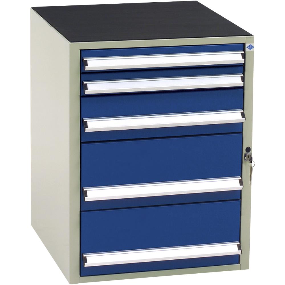 Skuffeskab i mange varianter, som muliggør den optimale indretning af lageret eller værkstedet. Letløbende skuffer på stålkuglelejer med 100 % udtræk giver optimal udnyttelse. Skufferne er udstyret med skuffespærre. Gribelisten i aluminium er monteret med tekstskinne i transparent folie. Toppen af skabet er som standard udstyret med en riflet gummimåtte. Fås i flere varianter.