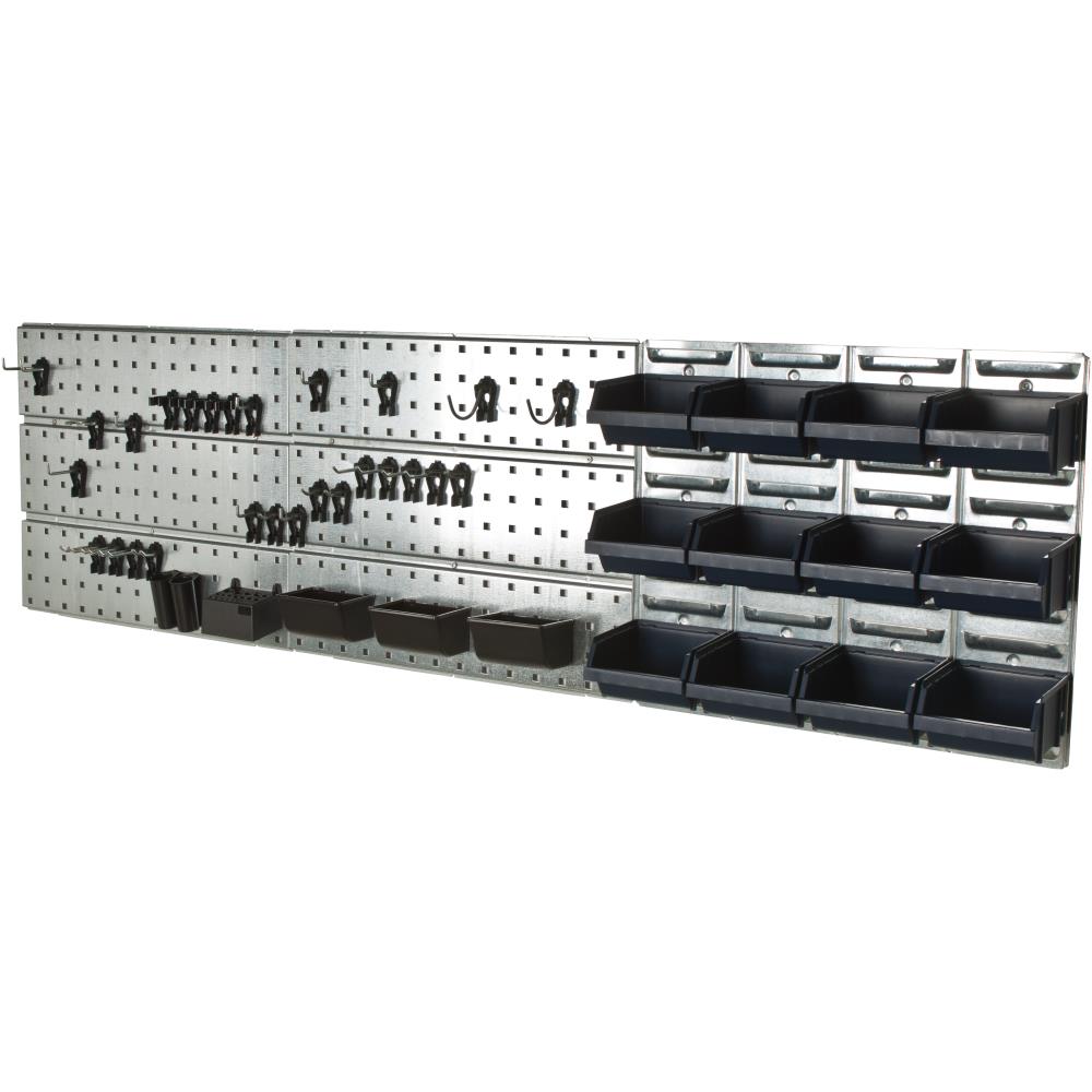 Værktøjsvæg med 3 hulplader, 33 assorterede clips til ophæng af værktøj og 12 lagerkasser. Hulplader er fremstillet i galvaniseret stål. Ekstra clips kan købes separat.