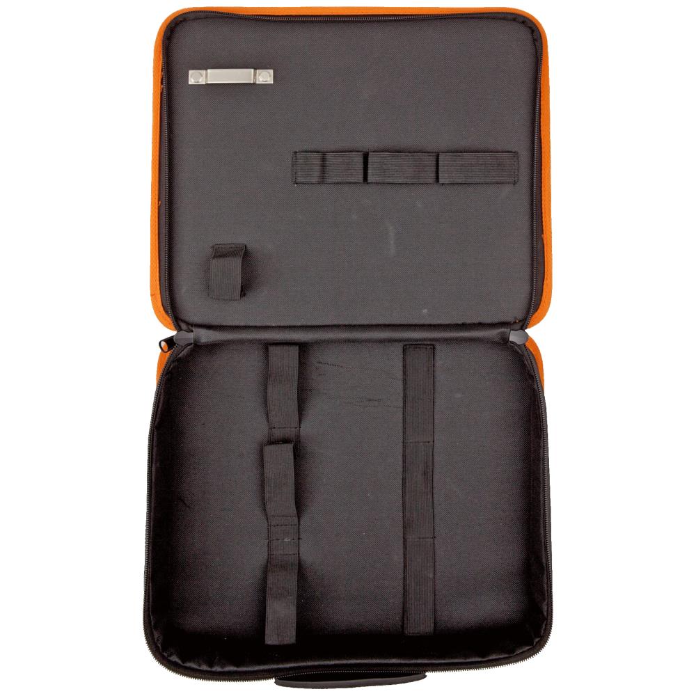 Værktøjsmappe i kraftigt stof med flere elastikker i bund og låg for bedre værktøjsfordeling. Mappen har blødt indvendigt for, kortholder foran og på siden til identifikation af eksternt indhold, lomme til målebånd, kortholder og mobil, samt forskellige lommer og separatorer. Fås i tre varianter hhv. mini (2,4 ltr.), medium (6,0 ltr.) og stor (12,0 ltr.)