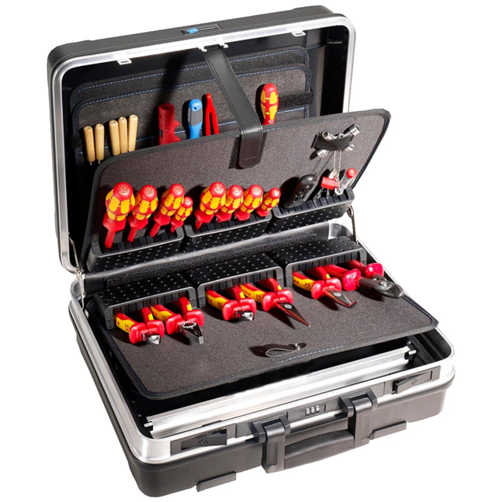 Base værktøjskuffert med værktøjsmoduler. Kufferten er fremstillet i slagfast ABS-plast med kraftig aluminiumsramme og gummilister. Nyt og moderne design med ergonomisk håndtag og A4-dokumentmappe i låget. Base er udstyret med to nøglelåse og en kodelås. Volume 26 ltr. Maks. belastning 25 kg. Leveres uden værktøj.