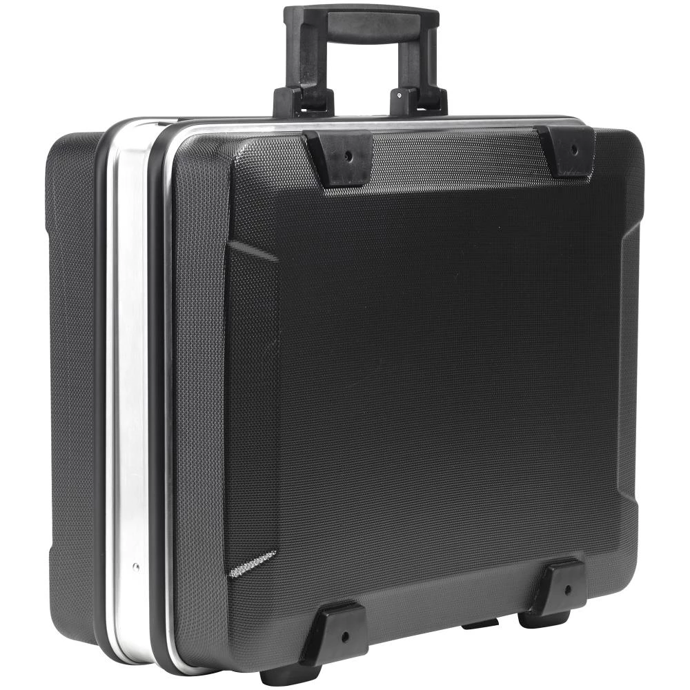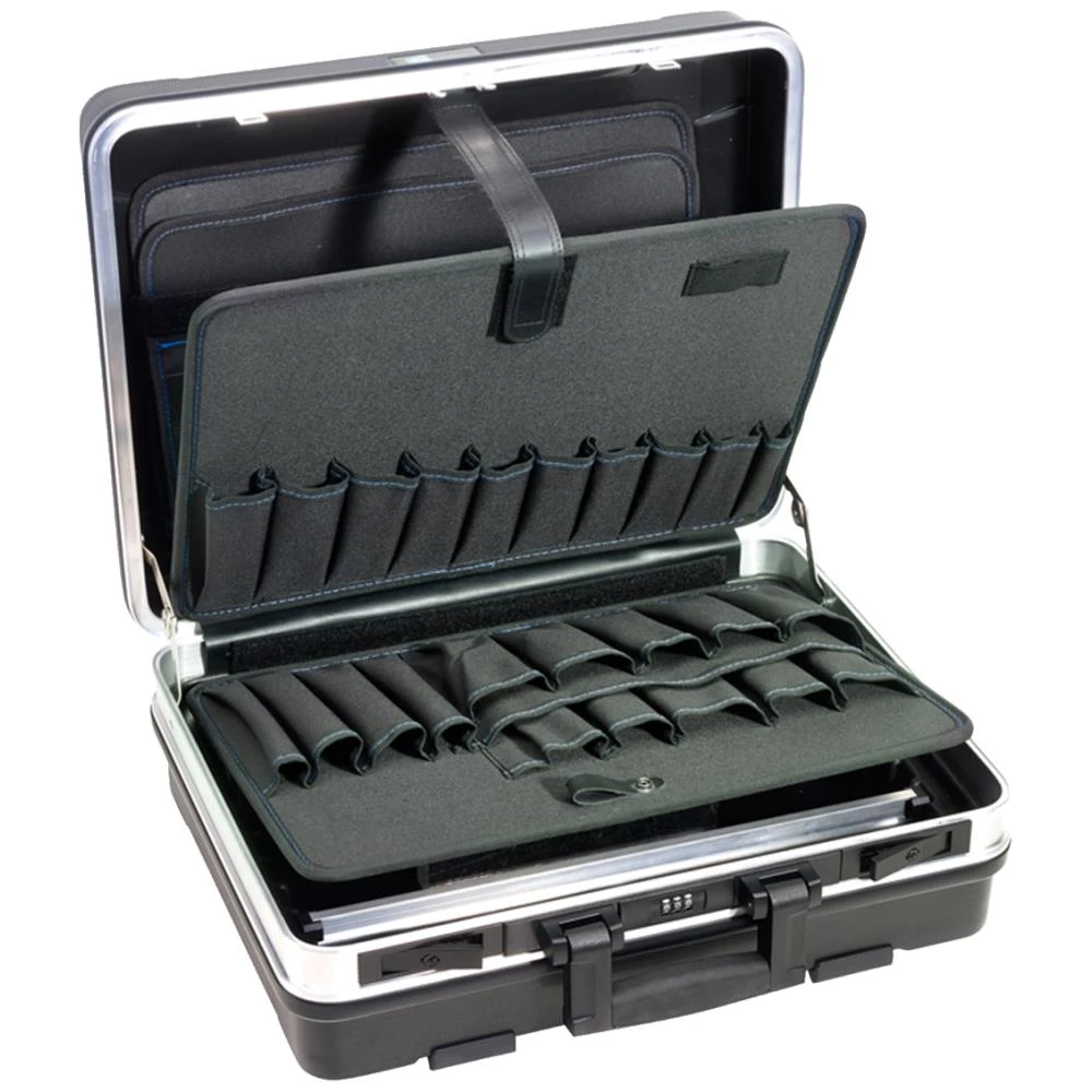 Praktisk og funktionel værktøjskuffert i ABS-plast med aluminiumsramme som gør den robust. Indeni er kufferten udstyret med en lomme med plads til dokumenter, to aftagelige værktøjstavler med lommer til værktøjet samt en bund med et aluminium opdelingssystem, som kan tilpasses individuelt. Kufferten er desuden udstyret med kombinationslås samt en robust metallås, så indholdet kan sikres. Volume 28,1 ltr. 37 værktøjslommer. Maks. belastning 25 kg. Leveres uden værktøj.