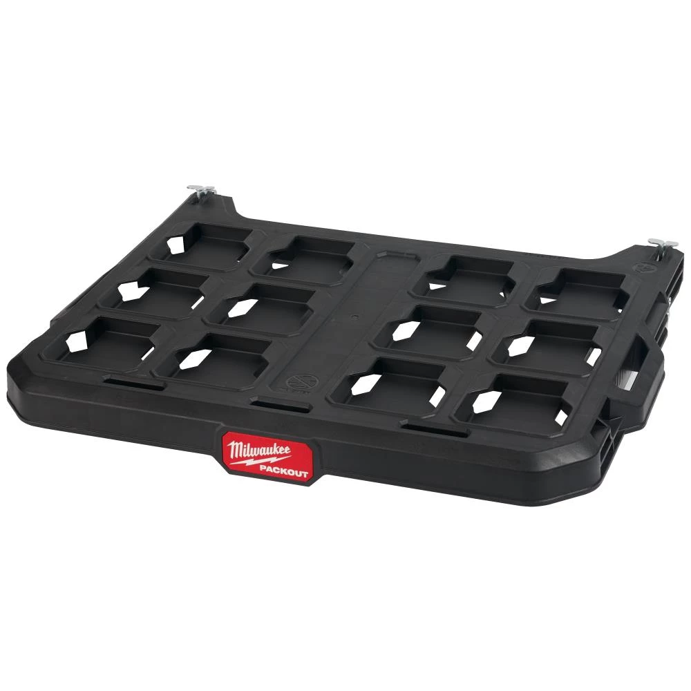 Packout E-track hyldesystem til montering på vægge i biler, butikker eller garager. Hurtigudløsende design for let montering, højdejustering og fjernelse af hylderne. Metalforstærket ramme og slagfast polymerkonstruktion. Hver enkelt hylde kan bære op til 22 kg. En del af Packout modul opbevaringssystem.