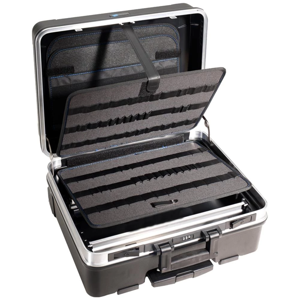 Go værktøjskuffert med trolley-funktion er praktisk og professionel, og dækker de fleste behov. Kufferten er fremstillet af slagfast HDPE-materiale med kraftig aluminiumsramme og gummilister. Nyt og moderne design med ergonomisk teleskophåndtag og kuglelejehjul i hjørnerne for god og stabil transport. Go er udstyret med beskyttede hængsler samt to nøglelåse og en kodelås. Indeni er GO indrettet med stropper til sikring af værktøj, A4-dokumentmappe i låget og variabel bundinddeling. Volume 36 ltr. Maks. belastning 30 kg. Leveres uden værktøj.