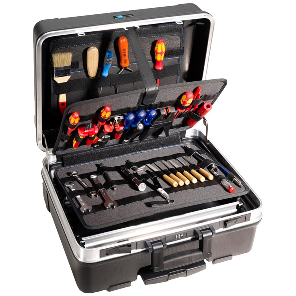 Go værktøjskuffert med trolley-funktion er praktisk og professionel, og dækker de fleste behov. Kufferten er fremstillet af slagfast HDPE-materiale med kraftig aluminiumsramme og gummilister. Nyt og moderne design med ergonomisk teleskophåndtag og kuglelejehjul i hjørnerne for god og stabil transport. Go er udstyret med beskyttede hængsler samt to nøglelåse og en kodelås. Indeni er GO indrettet med stropper til sikring af værktøj, A4-dokumentmappe i låget og variabel bundinddeling. Volume 36 ltr. Maks. belastning 30 kg. Leveres uden værktøj.