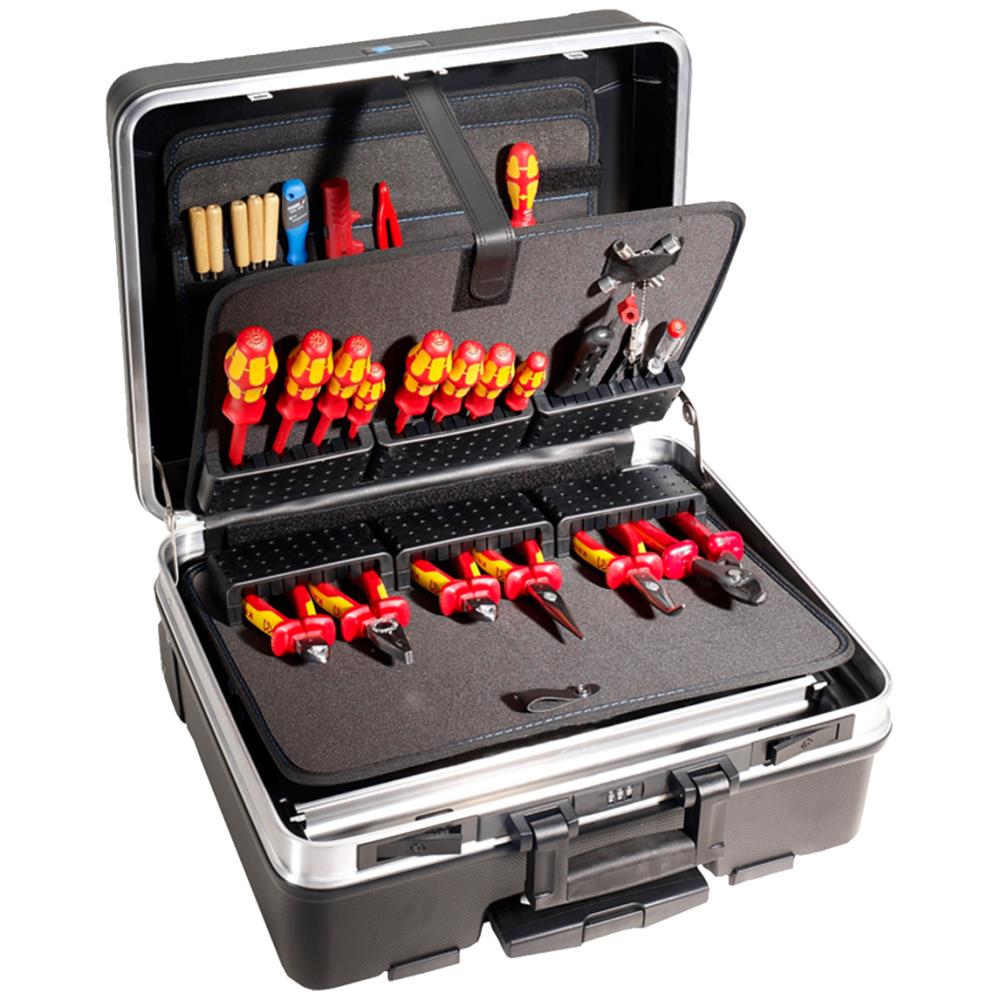 Go værktøjskuffert med trolley-funktion er praktisk og professionel, og dækker de fleste behov. Kufferten er fremstillet af slagfast HDPE-materiale med kraftig aluminiumsramme og gummilister. Nyt og moderne design med ergonomisk teleskophåndtag og kuglelejehjul i hjørnerne for god og stabil transport. Go er udstyret med beskyttede hængsler samt to nøglelåse og en kodelås. Indeni er GO indrettet med værktøjsmoduler til sikring af værktøj, A4-dokumentmappe i låget og variabel bundinddeling. Volume 36 ltr. Maks. belastning 30 kg. Leveres uden værktøj.