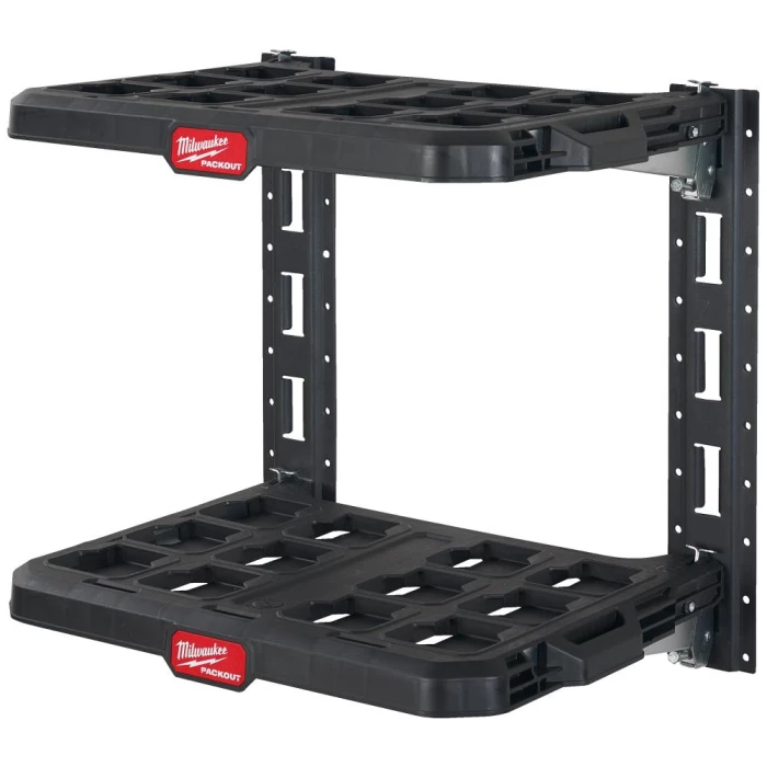Packout E-track hyldesystem til montering på vægge i biler, butikker eller garager. Hurtigudløsende design for let montering, højdejustering og fjernelse af hylderne. Metalforstærket ramme og slagfast polymerkonstruktion. Hver enkelt hylde kan bære op til 22 kg. En del af Packout modul opbevaringssystem.
