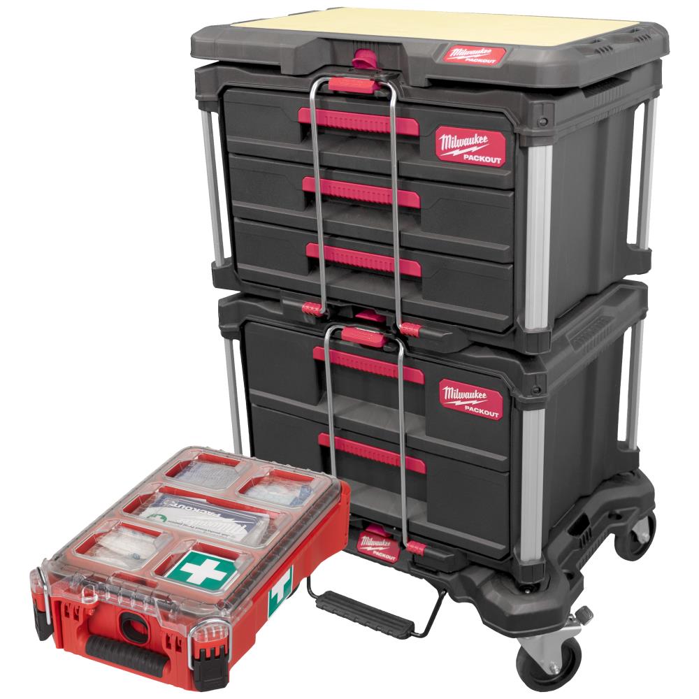 Packout sampak med transportkit og førstehjælpskasse. Packout transportkit med transportabel arbejdsbordplade, skuffeboks med to skuffer, skuffeboks med tre skuffer, og transportbase med hjul. Nem at flytte rundt på arbejdspladsen. Værktøj altid lige ved hånden. En del af Packout opbevaringssystemet. Packout førstehjælpskasse (DIN 13157 certificeret). I en nødsituation kan førstehjælpskassen hurtigt genkendes på grund af den røde farve. Kassen er konstrueret i slagfast polymer for holdbarhed på byggepladsen. IP65-klassificeret vejrforsegling for at forhindrer regn og snavs på arbejdspladsen. Indeholder 5 flytbare og monterbare beholdere. Forseglede beholdere for at forhindre, at indholdet vandrer mellem beholderne under transport. Indhold: 1× forbrændingsbandage 60×80 cm, 4× engangshandsker i vinyl, 2× trekantet armslynge 96×96×136 cm, forskellige førstehjælpsbandager (5 stk.), 2× elastisk bandage 6 cm × 4 mtr., 2× elastisk bandage 8 cm × 4 mtr., 2× øjenkompres oval 50×70 mm, 1× saks, 1× redningstæppe 210×160 cm, 1× taperulle 2,5 cm × 5 mtr., 8× elastisk plaster 10 cm × 6 cm, 5× fleece, 6× kompresforbindinger 10×10 cm, 2× plastposer m. lynlås, 4× plaster 12×2 cm, 4× plaster 4×7 cm, 4× plaster 19×72 mm, 8× plaster 25×72 mm, 1× ispose, 1× førstehjælpsinstruktioner, 1× indholdsfortegnelse.