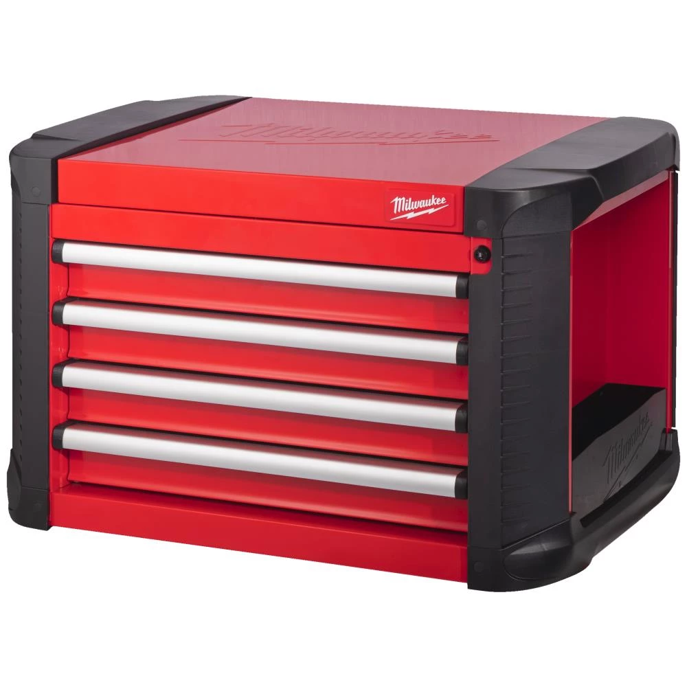 Topkabinet i stål med fire skuffer. Skufferne er udstyret med softclose og hver skuffe leveres med skridsikker indlægsmåtte. Anti-vippe beskyttelse så kun én skuffe kan være åben ad gangen. ABS hjørnebeskyttelse forhindrer skader under transport rundt i værkstedet. Ekstra hylder på siden til flasker og dåser. Kapacitet pr. skuffe 45 kg.