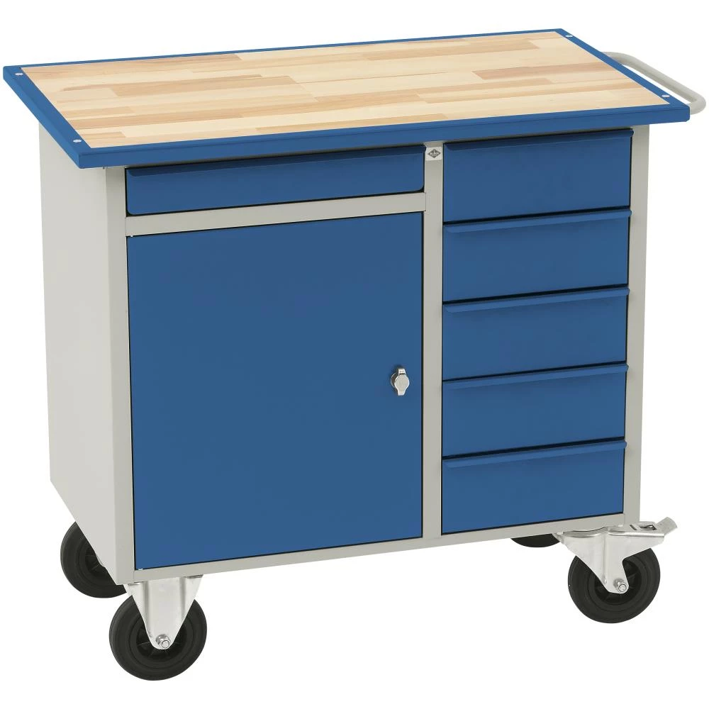 Værkstedsvogn – mobil og fleksibel arbejdsstation med god plads til opbevaring. Værkstedsvognen leveres med bordplade i bøgeparket med stålramme. To faste og to drejelige hjul med bremse. Modellen har fem smalle skuffer og en bred skuffe samt en skabssektion med en flytbar, galvaniseret hylde. Alle skuffer er med letløbende rulleudtræk. Maks. belastning: den brede skuffe 30 kg, de smalle skuffer 35 kg pr. skuffe, hylde 30 kg, hele vognen (jævnt fordelt) 500 kg. Værkstedsvognen leveres med centralt låsegreb, forberedt for hængelås. Fås i flere varianter.