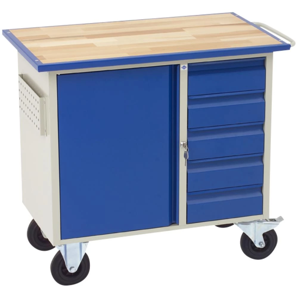 Værkstedsvogn med værktøjstavler og tegningslomme – robust og funktionel. Værkstedsvognen leveres med bordplade i bøgeparket med stålramme. To faste og to drejelige hjul med bremse. Modellen har fem skuffer med stålkugleudtræk og skuffespærre, der sikrer enkeltvis udtrækning af skuffer, skabssektion med dør i dobbeltplade og med værktøjstavle på indvendige side. Skabet har en flytbar, galvaniseret hylde. Tegningslomme på siden, kan bruges som værktøjstavle. Maks. belastning: skuffer 45 kg pr. skuffe, hele vognen (jævnt fordelt) 500 kg. Værkstedsvognen leveres med centrallås. Fås i flere varianter.