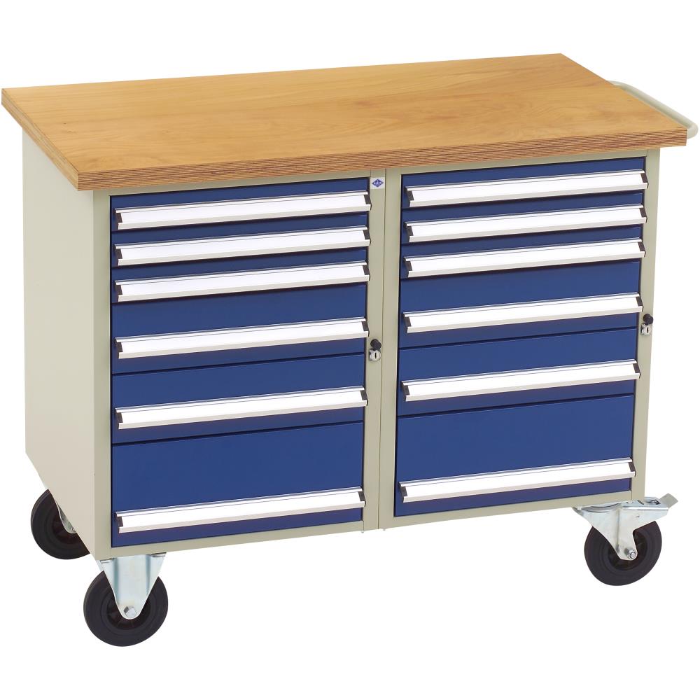 Værkstedsvogn med flere kombinationsmuligheder – for individualitet og funktionalitet. Vognen leveres med Multiplex bordplade. To faste og to drejelige hjul med bremse. VVM-vognen kan kombineres med skabe- og skuffesektioner efter behov. Enten en sektion af hver eller to af samme slags. Skuffesektionen består af 4-10 skuffer på stålkuglelejer med 100 % udtræk. Centrallås for alle skuffer samt enkelt skuffespærre. Skabssektionen består af et værktøjsskab med en flytbar galvaniseret hylde. Låsene i de to sektioner er enslukkende. Belastning: skuffer 45 kg pr. skuffe, hylde 30 kg, hele vognen (jævnt fordelt) 500 kg.