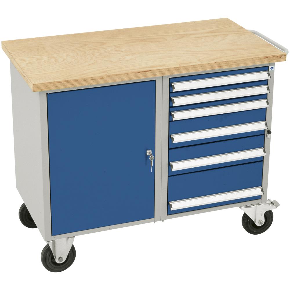 Værkstedsvogn med flere kombinationsmuligheder – for individualitet og funktionalitet. Vognen leveres med Multiplex bordplade. To faste og to drejelige hjul med bremse. VVM-vognen kan kombineres med skabe- og skuffesektioner efter behov. Enten en sektion af hver eller to af samme slags. Skuffesektionen består af 4-10 skuffer på stålkuglelejer med 100 % udtræk. Centrallås for alle skuffer samt enkelt skuffespærre. Skabssektionen består af et værktøjsskab med en flytbar galvaniseret hylde. Låsene i de to sektioner er enslukkende. Belastning: skuffer 45 kg pr. skuffe, hylde 30 kg, hele vognen (jævnt fordelt) 500 kg.