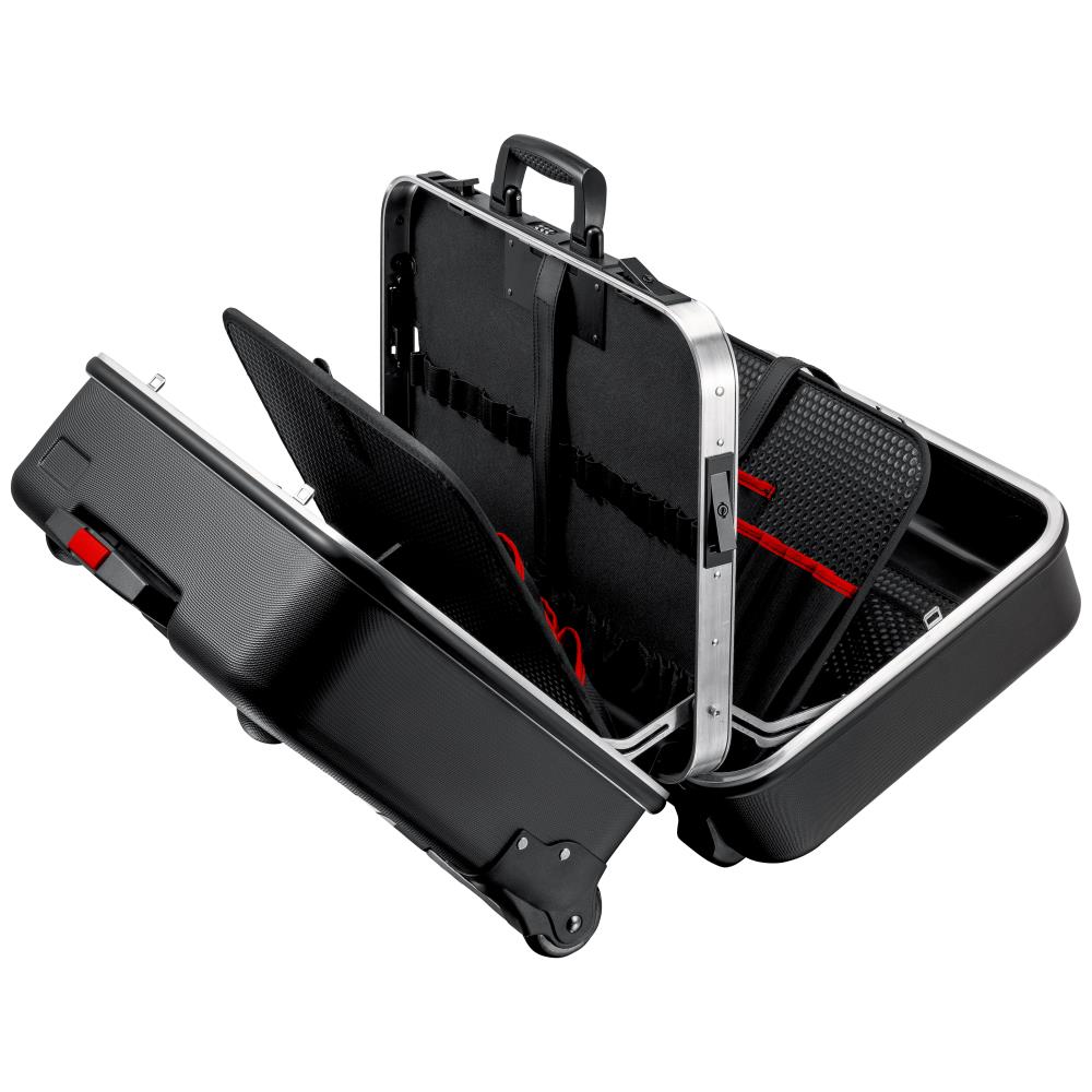 Big Twin-move værktøjskuffert med i alt 95 indstiksmuligheder. Bundskål, kan fastgøres med trykknap, højde 58 mm, kan inddeles yderligere med fleksible indsatser, og med dæktavle med 13 værktøjslommer. Står frit i alle åbningspositioner pga. af lågholder i begge sider med hængselsmekanik, kan indstilles i alle vinkler. Udtagelig dokumentlomme og udtagelige værktøjstavler af smudsafvisende PP-hulkammerplader med 13 værktøjslommer. Tekstfelt med to mærkater til individuel markering. Bund med integreret teleskopgreb samt to udvendige letløbende scater-hjul. Slidstærk udførelse af ABS-materiale, sort. Aluminiumramme med fast monteret, stabil og dobbeltsidet midtervæg med mange indstiksmuligheder i form af elastiske bånd og tolv små lommer. Metalhængsler. Trecifret tallås, så kufferten kan aflåses forsvarligt. To metal-vippelåse til fastgørelse af henholdsvis låget og bunden. Kan åbnes i en eller begge sider – bund og låg kan åbnes uafhængigt af hinanden. Maks. last 30 kg. Kapacitet 38 ltr.