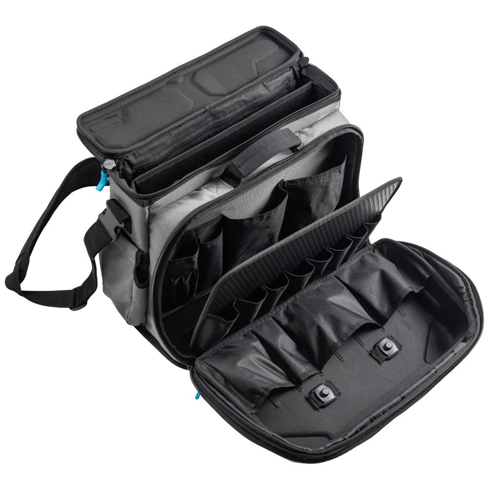FidLock Tex-223 værktøjstaske – robust og giver maksimal fleksibilitet på byggepladsen. Tasken kan udvides med fem ekstra moduler ved hjælp af FidLock systemet. Disse moduler kan fastgøres til værktøjstasken eller til et bælte. Værktøjstasken er fremstillet af slidstærk polyester med holdbare lynlåse. Designet byder på justerbar og polstret skulderrem, forlomme der åbner 90° med 4 lommer, aftageligt værktøjspanel med 10 løkker og 8 lommer, 2 fastgørelsespunkter til værktøjsmoduler med Fidlock-systemer, indvendig lomme til notesbog og A4-dokumenter, samt bagklap til fastgørelse på vogne under transport. Volumen 22,3 ltr. Bæreevne 10 kg. Leveres uden værktøj og tilbehør.