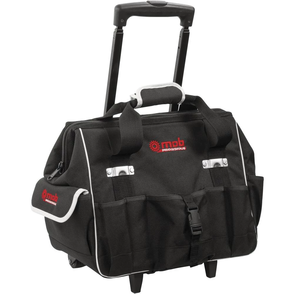 Værktøjstrolly i tekstil med hjul og sammenklapligt håndtag. Str. 480×245×395 mm. Design med 15 indvendige og 10 udvendige lommer.