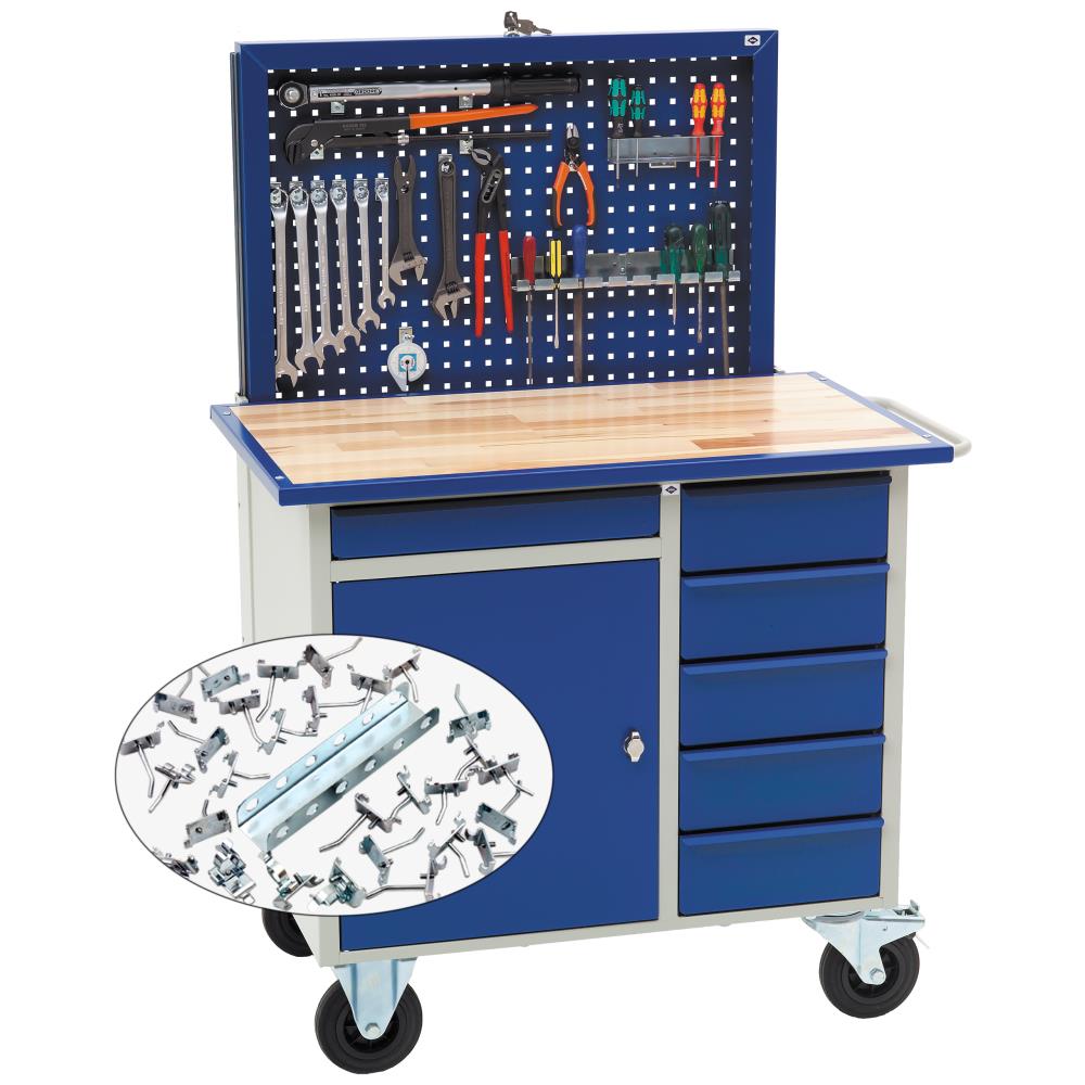 Værkstedsvogn – mobil og fleksibel arbejdsstation med god plads til opbevaring. Værkstedsvognen leveres med bordplade i bøgeparket med stålramme. To faste og to drejelige hjul med bremse. Modellen har fem smalle skuffer og en bred skuffe samt en skabssektion med en flytbar, galvaniseret hylde. Alle skuffer er med letløbende rulleudtræk. Maks. belastning: den brede skuffe 30 kg, de smalle skuffer 35 kg pr. skuffe, hylde 30 kg, hele vognen (jævnt fordelt) 500 kg. Værkstedsvognen leveres med centralt låsegreb, forberedt for hængelås. Fås i flere varianter.